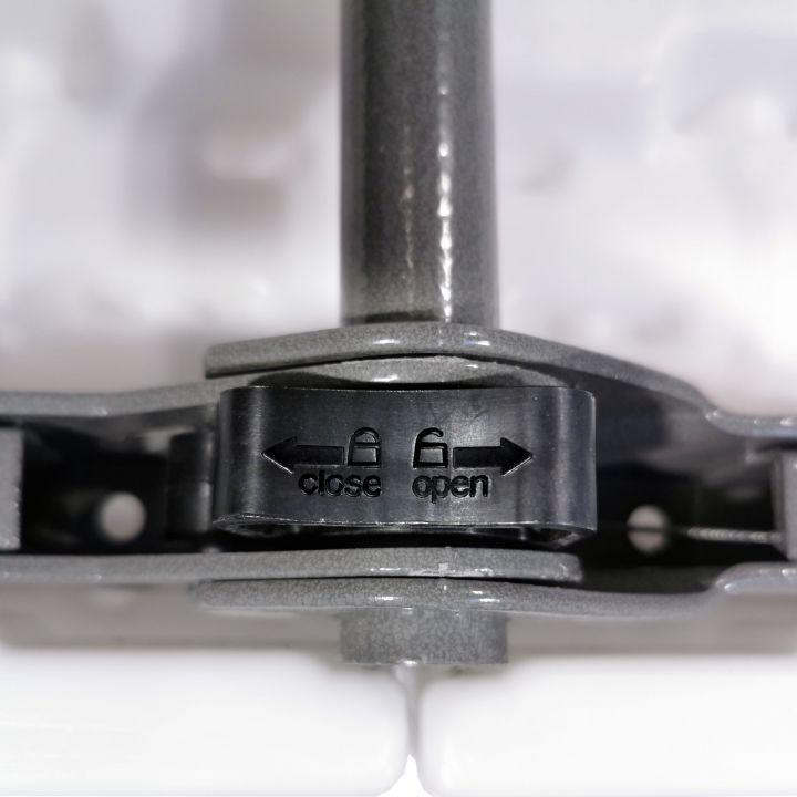 - Die Beine sind aus Stahl und falten sich beim Zusammenklappen zu einer Kunststoffplatte.
